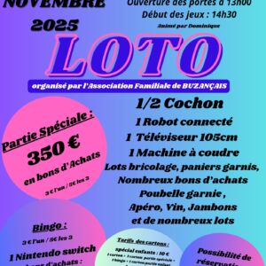 L'association familiale de Buzançais vous invite à son loto festif le dimanche 23 novembre 2025, à ...